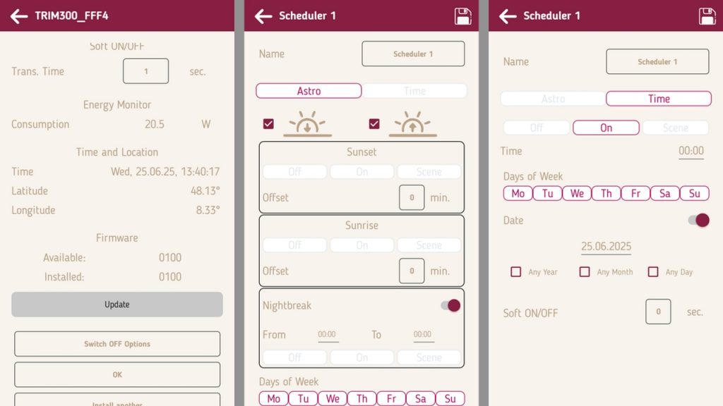 The top-tier trim 300 adds even more functionality. Like the trim 200, it supports Bluetooth Mesh and app-based control, but it also functions as a programmable timer. It includes a weekly schedule, yearly calendar, and astronomical functions like fade-in and fade-out based on sunrise and sunset. A seven-hour power reserve keeps the clock running during outages, and custom scenes let users store and recall lighting moods. It even includes energy monitoring to keep an eye on power consumption.
